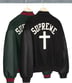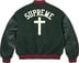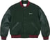 Wool blend with cowhide leather sleeves, fill and quilted satin lining. Snap front closure with double welt leather hand pockets at lower front and interior chest pocket. Knit rib collar, cuffs and hem. Embroidered logo on chest with tackle twill appliqué at back.