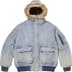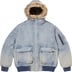 All cotton denim with 3M® Thinsulate™ insulation and faux fur reverse side. Full zip closure with hidden snap placket. Patch hand pockets at lower front with dual top zip and side snap entry. Utility pocket at sleeve. Fixed hood with faux fur trim. Faux fur reverse side with welt hand pockets at lower front. Inset logo appliqué at back.