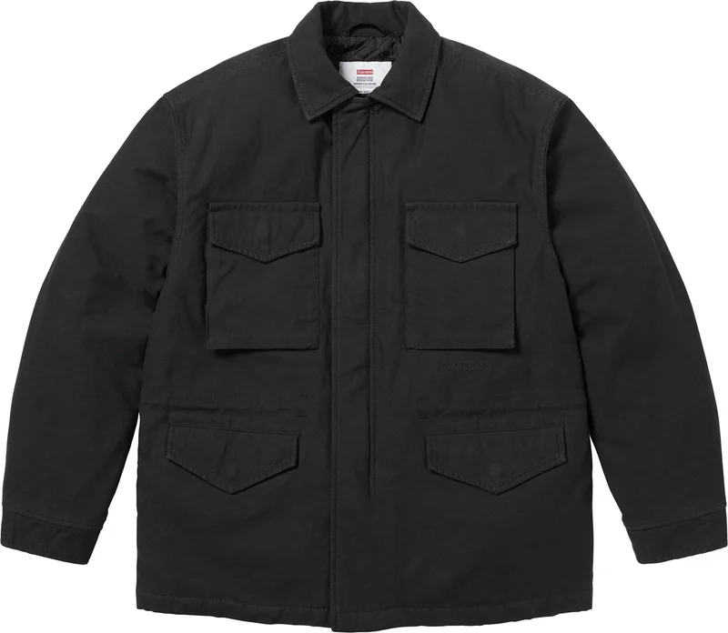 Military spec NYCO twill with fill and quilted taffeta lining. Full zip closure with hidden snap placket. Snap flap pockets at lower front and chest. Interior drawcord at waist with tab adjusters at cuffs. Embroidered logo on chest and embroidered graphic on back. Original embroidered artwork by AOI. Made by Alpha Industries exclusively for Supreme.