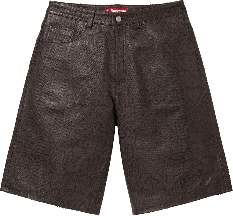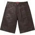 Lambskin leather with baggy fit and taffeta lining. Classic 5-pocket style with zip fly, single coin pocket, copper oxide rivets and embroidered logo on back pocket.