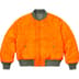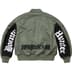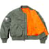 Water resistant nylon flight satin twill with fill and full zip closure. Snap flap hand pockets at lower front with utility pockets at sleeve and interior snap pockets. Knit rib cuffs and hem. Woven twill inset panels with printed graphic at back sleeves. Embroidered graphic on sleeve and printed logo on back hem. Enamel pin included. Made by Alpha Industries exclusively for Supreme.