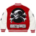 Wool blend with cowhide leather sleeves, fill and quilted satin lining. Snap front closure with double welt leather hand pockets at lower front and interior chest pocket. Stripe rib collar, cuffs and hem. Felt and chenille appliqué at chest, sleeves and back.