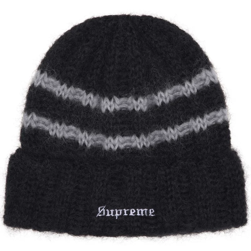 Mohair blend cuffed beanie with embroidered logo on cuff.