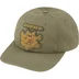 All cotton chino twill 6-Panel hat with custom debossed leather strap closure. Beaded bullion embroidered patch at front and embroidered logo on back.