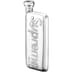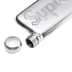 3 oz. pewter flask with molded graphic and logo. 4.75" x 2" x .5".