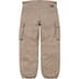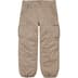 All cotton with enzyme wash. Snap flap slanted front pockets and snap flap back pockets. Snap flap cargo pockets at thighs. Zip fly closure, snap closure, twill tape size adjusters at waist and drawstring at cuffs.