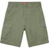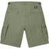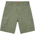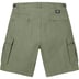 All cotton with enzyme wash. Slanted front pockets and snap flap back pockets. Snap flap cargo pockets at thighs. Button fly closure and twill tape size adjusters at waist.