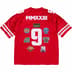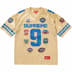 Poly eyelet mesh with dazzle yoke and embroidered patch pattern. Tackle twill appliqué at front, shoulders and back. Athletic label at lower front.