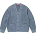 Acrylic blend with metallic yarn. Button front closure with hand pockets at lower front. Embroidered logo on left pocket.