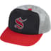 Poly 6-Panel hat with mesh back and snap closure. Twill logo appliqué at front and embroidered logo on back.
