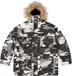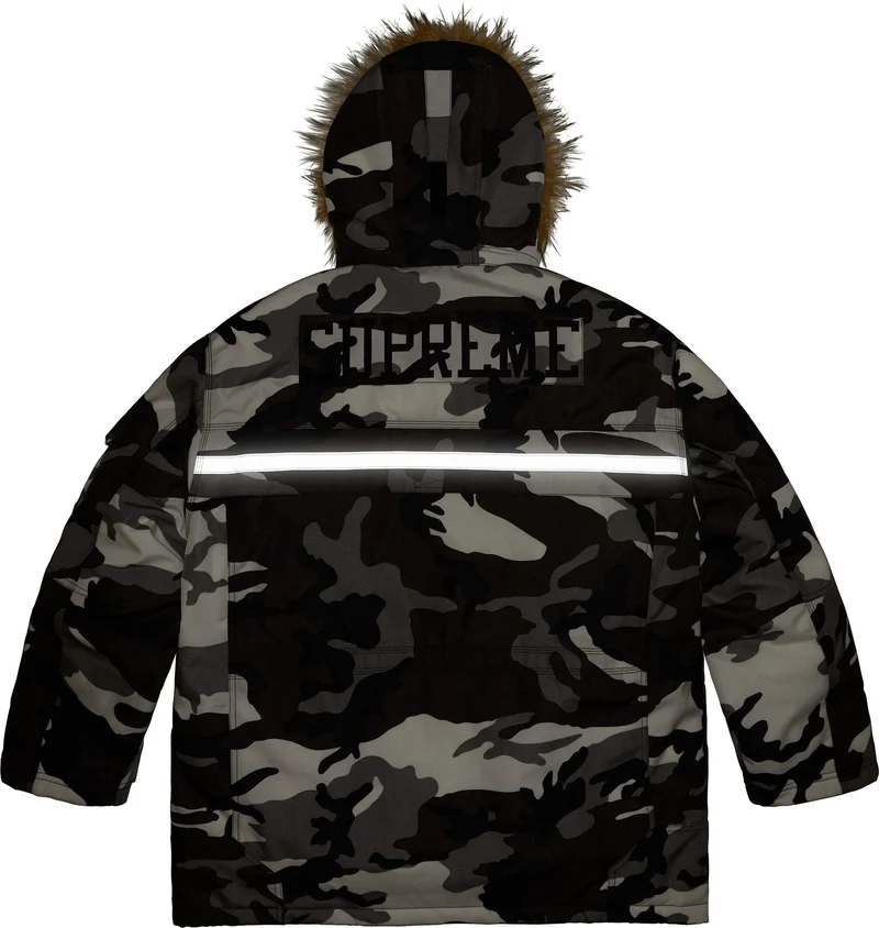 Water resistant Cordura® nylon with interior quilted baffles, GORE WINDSTOPPER® drop liner and quilted nylon lining. Full zip closure with snap placket. Velcro flap patch pockets at lower front and chest with dual top and side entry. Velcro flap cargo pockets on chest and sleeve. Interior zip and mesh pockets. Removable hood with velcro tab adjuster and removable faux fur trim. Interior elastic shockcord at hem and interior knit rib cuffs. Velcro flap at back with 3M® Reflective stripe appliqué. Embroidered logos on cuffs and printed logo patch on back.