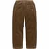 All cotton corduroy with on seam hand pockets and patch pockets at seat. Interior drawcord at elastic waistband. Embroidered logo on back pocket.