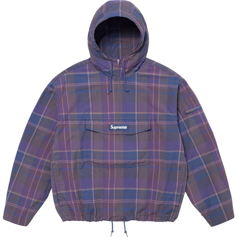 Cotton with half zip closure. Welt hand pockets at lower front and zip flap patch pocket at chest. Zip stash pocket at sleeve and zip patch pockets at back hem. Interior drawcord at fixed hood and hem with snap closures at cuffs. Woven logo label at chest pocket.