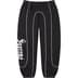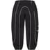 Brushed-back fleece with on seam hand pockets and single back patch pocket. Elastic cuffs and waistband with interior drawcord. Piping throughout with raised embroidered logo at lower leg.