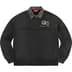 Brushed-back fleece with cotton denim collar and boxy fit. Half zip closure with on seam hand pockets at lower front. Embroidered graphic on chest.
