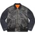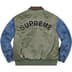 Water resistant nylon flight satin twill with fill and full zip closure. Cowhide leather collar and cotton denim sleeves. Snap flap hand pockets at lower front and interior snap pockets. Tab adjusters at cuffs and knit rib hem. Logo appliqué at back. Enamel pin included. Made by Alpha industries exclusively for Supreme.