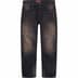 All cotton 13 oz. Japanese English denim with loose fit, heavy wash and hand-applied distressed treatment. Classic 5-pocket style with button fly, single coin pocket, copper oxide rivets and embroidered logo on back pocket. Made in Japan.