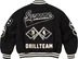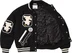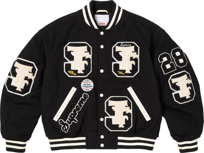 Wool blend with fill and quilted satin lining. Snap front closure with double welt leather hand pockets at lower front and interior chest pocket. Stripe rib collar, cuffs and hem. Felt and chenille appliqué at front, sleeves and back.