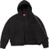 Wool blend with faux shearling lining and full zip closure. Hand pockets at lower front and intarsia knit logo at back.