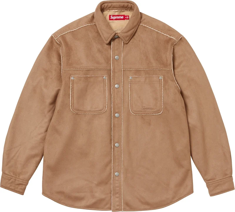 Faux suede with bonded poly pile. Snap front closure with patch pockets at chest. Embroidered logo on left chest pocket.