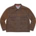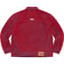 All cotton 13 oz. denim with distressed flocking print. Button front closure with on seam hand pockets at lower front and button flap patch pockets at chest. Tab adjusters at cuffs and back hem with leather logo patch. Metal logo plate at back neck.