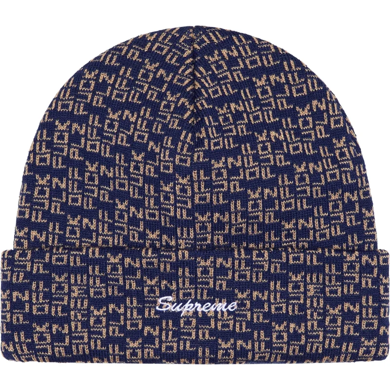 Acrylic cuffed beanie with jacquard knit pattern. Embroidered logo on cuff.