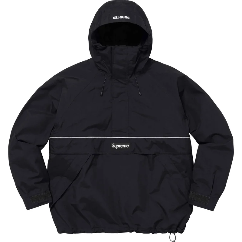 Waterproof, breathable GORE-TEX nylon with taped seams and embossed logo lining. Half zip closure with hidden velcro placket. Welt zip pouch pocket at lower front and hidden zip chest pocket. Interior elastic shockcord at fixed hood and hem. Side zip opening and velcro closures at cuffs. Woven logo label on chest and embroidered logo on hood. 3M® Reflective logo piping at chest.