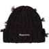 Acrylic cuffed beanie with hand-tied knots and embroidered logo on cuff.