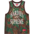 Poly eyelet mesh with printed pattern. Printed logo on chest with rhinestone appliqué. Athletic label at lower front.
