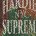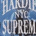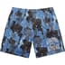 Poly eyelet mesh with printed pattern and mesh lining. On seam hand pockets and single back zip pocket. Elastic waistband with interior drawcord. Printed logo with rhinestone appliqué at thigh.