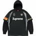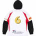 Poly jersey with cotton jersey sleeves and hood. Embroidered and printed graphics on chest, hood, sleeves and back.