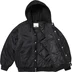Water resistant polyamide with 3M® Thinsulate™ insulation and quilted lining. Snap front closure with welt hand pockets at lower front and interior chest pocket. Knit rib collar, cuffs and hem. Brushed-back fleece hood with embroidered logo. Logo appliqué at back.