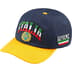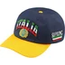Cotton blend twill 6-Panel hat with snap closure. Embroidered patches at front and sides. Embroidered logo on back.