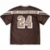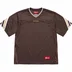 Poly eyelet mesh and dazzle with embroidered logo on chest. Jacquard knit logo rib and tackle twill graphic appliqué at back. Athletic label at lower front.