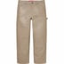 Lambskin leather with taffeta lining. Utility style with zip fly, double knee, single coin pocket, copper oxide rivets, utility pockets, hammer loop at left leg and leather logo patch on back.