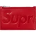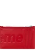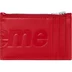 Calfskin leather card holder with debossed logo. Zip top pocket with three card slots at back. Made in Italy.