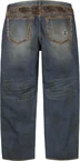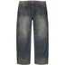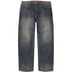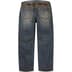 All cotton 13 oz. denim with faux fur panels, loose fit, heavy wash and hand-applied distressed treatment. Classic 5-pocket style with zip fly, single coin pocket, copper oxide rivets and embroidered logo on back pocket.