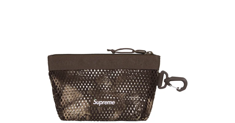 Poly eyelet mesh with main zip compartment and D-Ring tab at side. Jacquard logo webbing at top and woven logo label at lower front. 4.7" x 8.3" x 2.4".