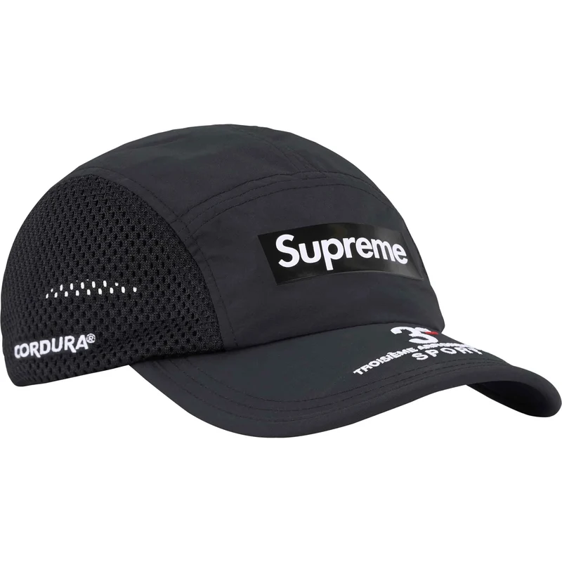 Cordura® nylon Supreme camp cap with mesh side panels and rubber logo patch. Embroidered graphic on visor and embroidered logo on side.