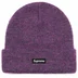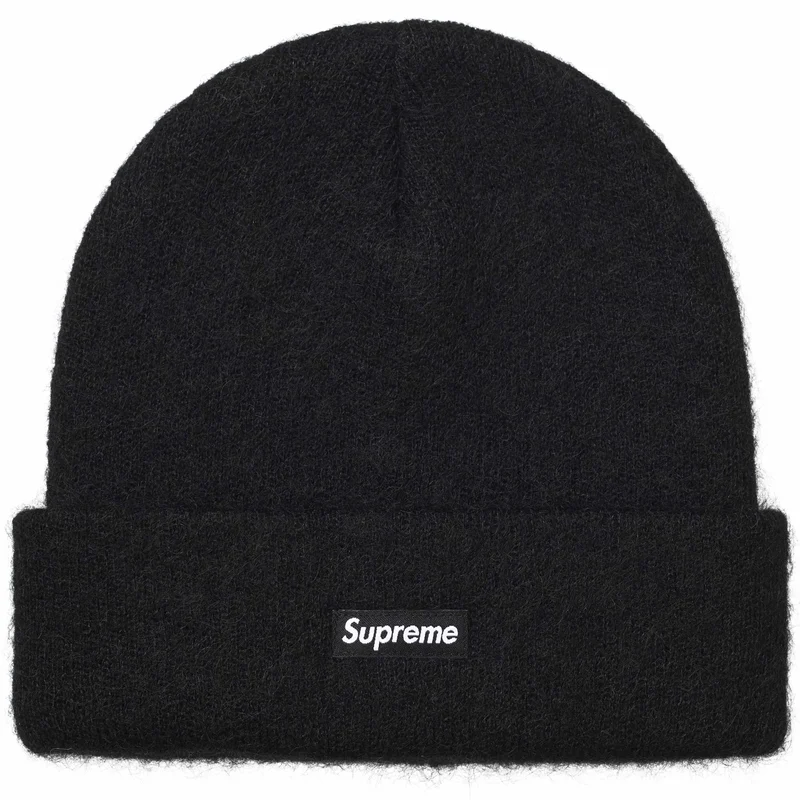 Mohair blend cuffed beanie with woven logo label at cuff.