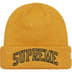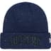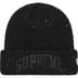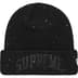 Acrylic cuffed beanie with sequin embroiderey. Glitter twill logo appliqué at cuff.