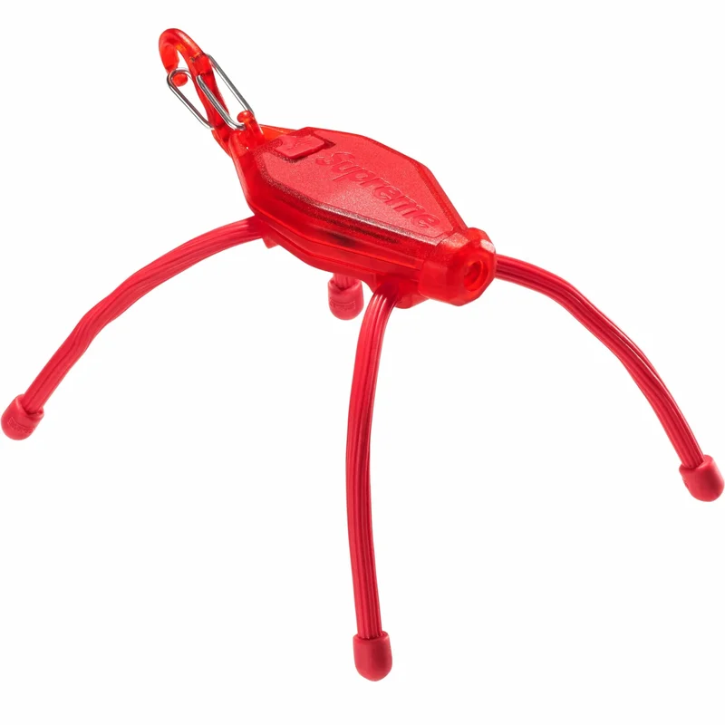 Micro flashlight with durable polycarbonate plastic housing and debossed logo. Effective range of up to 50 feet with four light modes. 6" moldable gear tie legs and S-biner clip. Made exclusively for Supreme.