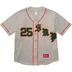 Poly eyelet mesh jersey with button front closure. Tackle twill appliqué at front and back. Athletic label at lower front.