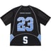 Poly eyelet mesh with dazzle sleeves. Tackle twill logo and graphic appliqué at front and back. Printed patch on back and athletic label at lower front.