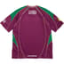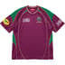 Poly jersey with stripe rib collar and contrast piping throughout. Embroidered patches on chest and sleeve. Printed graphics on chest, sleeve and back neck. Embroidered logo at back hem.