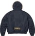 Water resistant nylon flight satin twill with fill and nylon twill lining. Full zip closure with snap flap hand pockets at lower front. Utility pocket at sleeve and interior welt snap hand pockets. Fixed hood with faux fur lining, interior drawcord, removable faux fur trim and size adjuster. Embroidered twill patches on chest and embroidered logo patch at back hem. Made by Alpha Industries exclusively for Supreme.