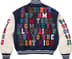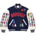 Wool blend with cowhide leather sleeves, fill and quilted satin lining. Snap front closure with double welt leather hand pockets at lower front and interior chest pocket. Stripe rib collar, cuffs and hem. Felt and chenille appliqué at front, sleeves and back.