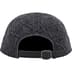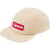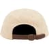 All cotton 15 oz. denim Supreme camp cap with needle punched pattern and custom debossed leather strap closure.