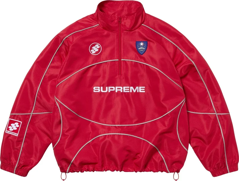 Water resistant poly hexagon ripstop with mesh lining and taffeta sleeve lining. Half zip closure with on seam hand pockets at lower front. Interior elastic shockcord at hem with elastic cuffs. Embroidered logo and graphic on chest. Woven logo patches on chest and sleeves. 3M® Reflective piping throughout.