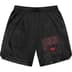Poly eyelet mesh with dazzle side panels and mesh lining. On seam hand pockets and single back zip pocket. Elastic waistband with interior drawcord. Printed graphics on thigh and back pocket.